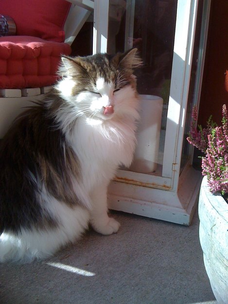 Langhåret, tillitsfull katt har oppholdt seg ved huset vårt et par dager. Hvit og sort/grå/brun, uten halsbånd.