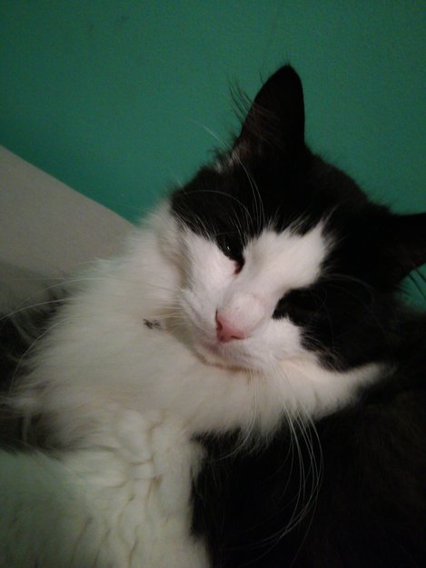 Svart og hvit lang pels, har en krage rundt halsen, gule/grønne øyne.