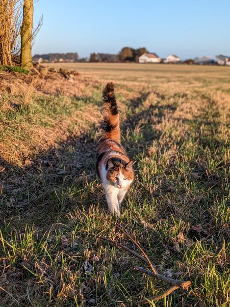 Tricolor hunnkatt kom på døren og tigget mat. Ikke lyktes å finne eier i lokale facebook grupper. Ikke chippet eller sterilisert. Får mat her inntil vi finner eier. Tam og rolig katt med blank og myk pels. Tydelig noen som eier den.