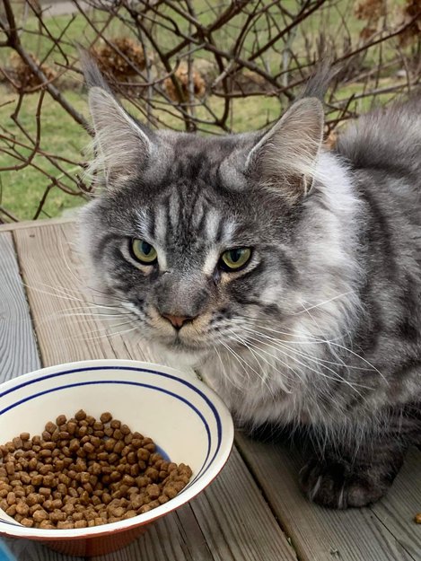 Nydelig grå/hvit/sort katt. Dusker i ørene. Striper i ansiktet. Spraglete på kropp.