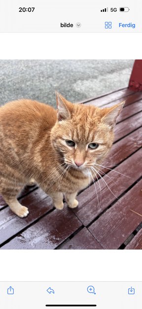Rød katt, litt redd har gått i lengre tid i området grønnestølen. Om natten har den lagt seg til i en hagestol utenfor døren. Det virker ikke som den har et hjem å gå til da den til stadig sover her. Prøvd å lokke den inn men den er litt for redd. Kanskje noen savner katten. Virker ikke som en villkatt da den ikke er så redd.