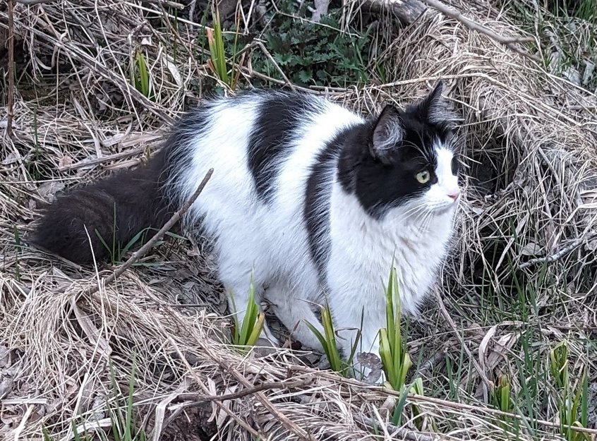 Relativt ung, antageligvis under 1 år. Svart og hvit lang pels.