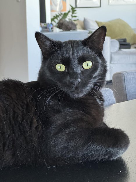 Helsvart katt med noen hvite hårstrå på brystkassen. Gule øyne. Veldig kosete og kjærlig.