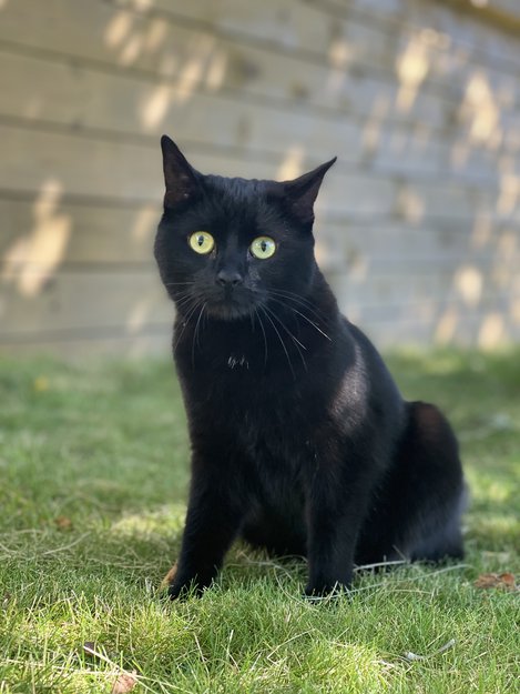 Helsvart, noen få hvite hår på brystet. Hun har en liten hårløs flekk bak på ene bakbenet akkurat i leddet.