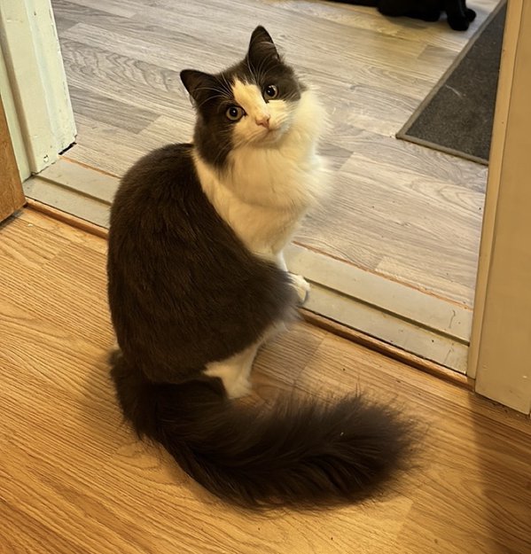 Utrolig pen katt. Grå og hvit. Støvkosthale. Hun er trygg og selvstendig, og veldig glad i mat.