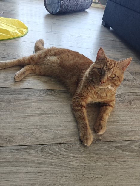 Pus har orange pels og er tigerstripet. På venstre bakpote har han en liten mørk flekk i pelsen. Gule øyne.