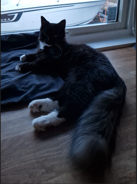 Sort katt med litt hvit på beina og halsen. Ganske stor halen. Katten er ca 8 måneder gammel.