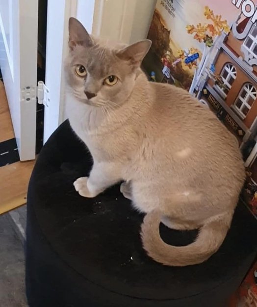 Innekatt som stakk av når en dør ble åpnet av barn. Er ikke vant til å være ute. Han er av rase burmeser og har ingen underpels, så han kan fryse ute når temperaturen går ned. På grunn av genfeil har han mistet pels noen steder på ryggen mot baklabbene. Han er kastrert og er redd nye mennesker, ellers er han veldig kosete.