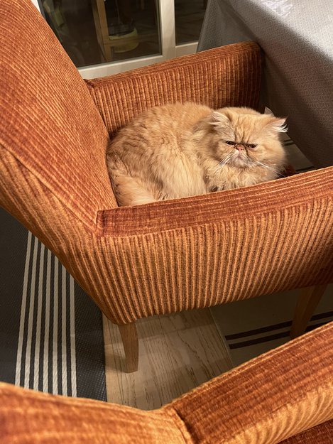 Han er en typisk persisk katt med « fluffy» pels, som er meget myk, da han ble børstet hverdag og fram til nå var han en typisk innekatt. Responderer lett på sitt navn, er veldig koset, spesielt med meg som er hovedeier, men er ellers veldig sosial og rolig. Han har intense « kobber farge» øyer, nesten som hans pels farge. Søker lett kontakt, spesielt med våre familie medlemmer og virker redd av å være ute.