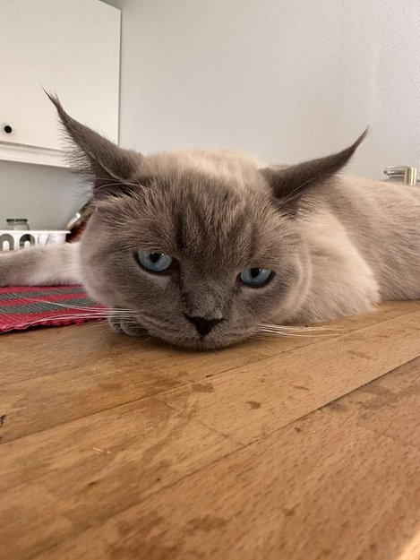 Shmi er et år gammel katt. Jeg kjøpte han igår. Han er ikke kjent med områda. Han har blå hals bånd med navn og nummer. Han er chippet