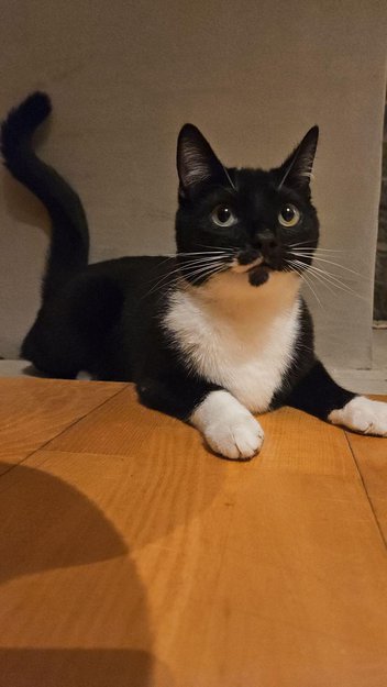 Svart katt med kvit hals, buk og potar. Nysgjerrig, sosial og gla i kos, men kan vere redd framande. Er nokså vokal.