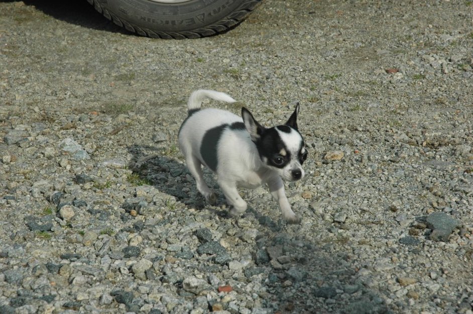Hun er hvit med sorte felt på rompa og rygg og ansikt. Over øyene har un svart felt med litt brunt og hvit flekk ser ut som hun har sminke på.ellers så har hun en krøll på den hvite halen.