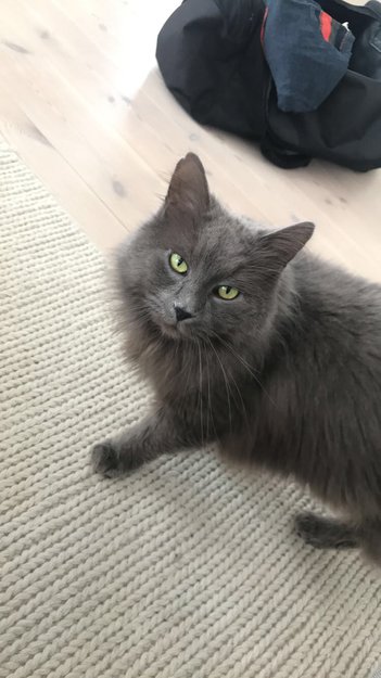 Kjennetegn: Langhåret, grå hannkatt. Han er veldig sosial og kosete, og kommer når du roper på han.