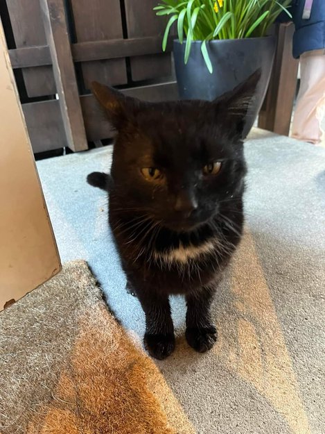 Helsort, litt stor, litt hvitt på halsen