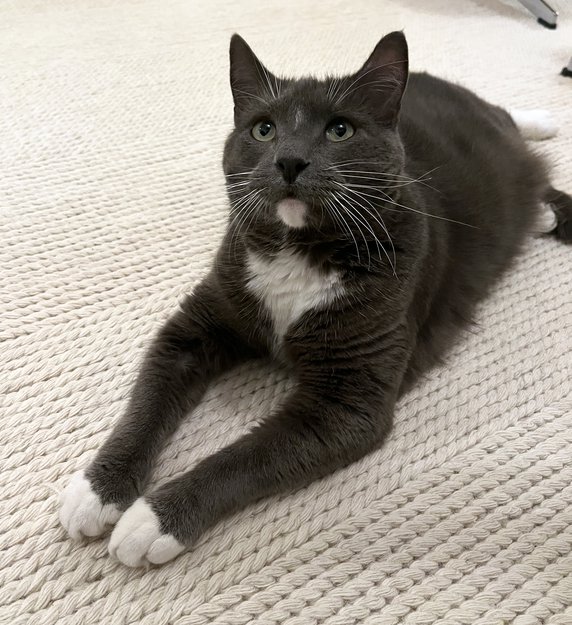 Katten er mørkegrå, men hvite poter og hvitt på brystet og under hakeippen.