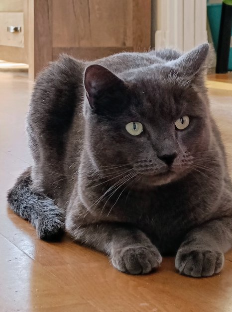 - Katt, Korthåret grå huskatt, ligner blå russer