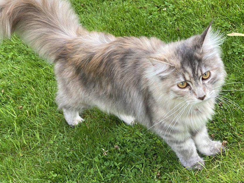 Lys gråbeige farge, litt lysere/beigere på undersiden. Har stor fluffy hale.