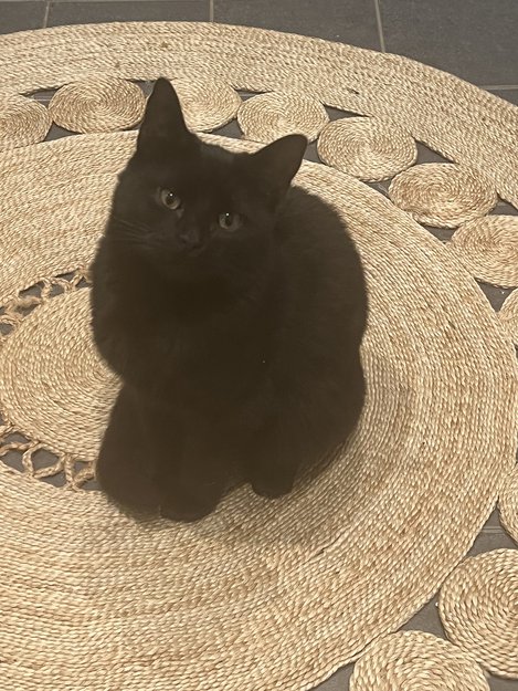 Liten hannkatt, ser nesten ut som en kattunge. Helsvart med noen hvite hår på ryggen/skulderen som er veldig vanskelig å se. Tillitsfull.