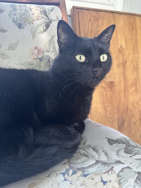 Svart katt, utslett på ryggen. Veldig kosete.