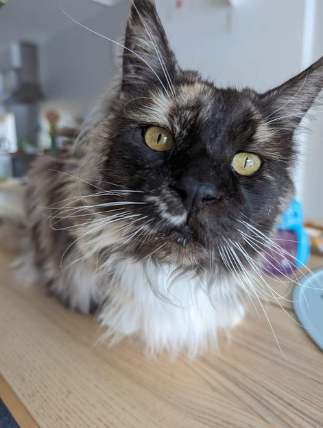 3.5 år gammel maine coon katt med fargete - brunn, hvitt og svart langt pels. Hun er veldig snill, liker mennesker og altid sjekker hva skjer, men ofte fra litt distanse.