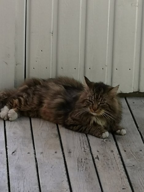 Den bare dukket opp her. Kommer hver dag! Trodde først det var en villkatt. Men den trenger sårt en klipp! "Prater" mye når jeg snakker til den,veldig sky, så jeg får ikke klappe den.