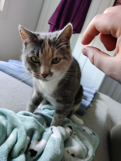 Lysegrønne øyne. Tykk og veldig myk pels. Veldig nyskjerrig på å lukte på deg, men liker ikke å bli tatt på av ukjente. Matmotivert. Rundt ansikt. Hvite sokker. Hun lystner ikke til navnet sitt.