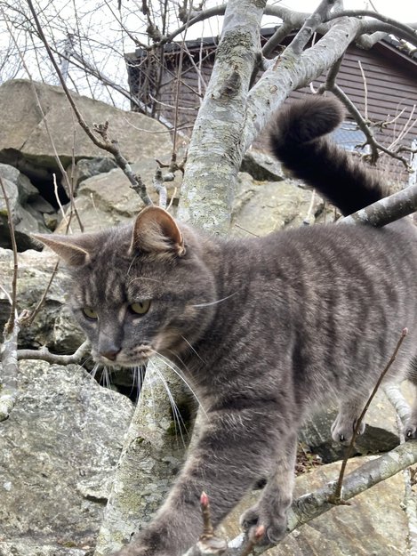Han er grå med litt striper. Han har ett arr på nesen som gjenkjenner han. Litt skvetten av seg. Kan være veldig kosen.