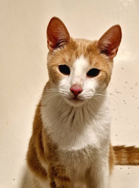 Ung katt, sannsynligvis en større kattunge. Litt tynn, men virker ikke syk. Fremtredende rosa nese, store og mørke øyne, svake striper på halen.