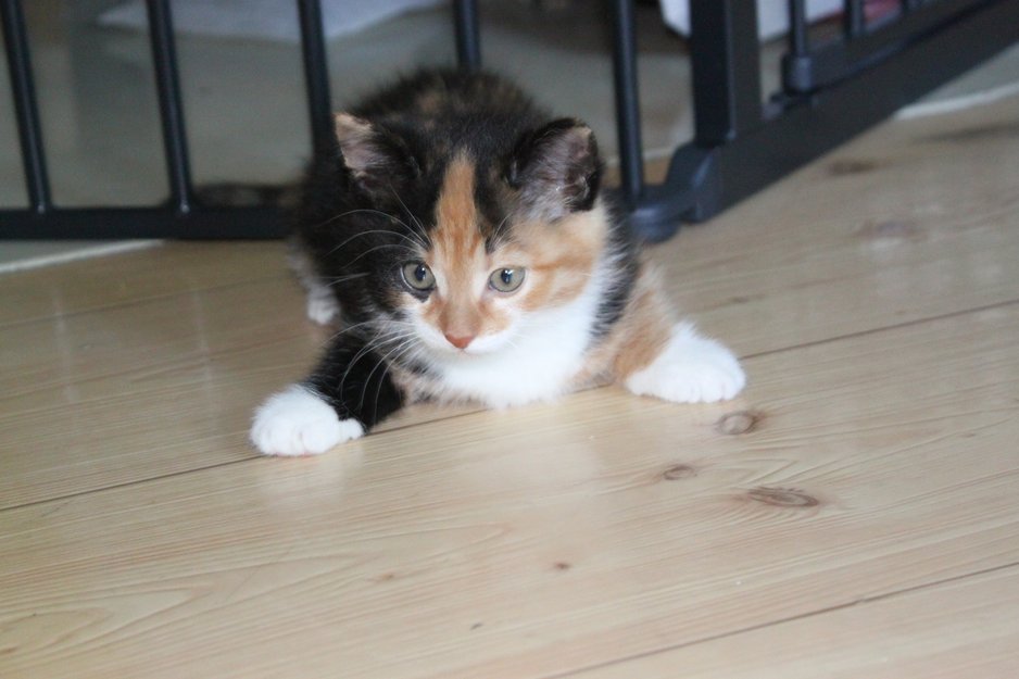 Mørk brun farge over rygg, oransje i ansiktet, hvit nedover halsen, høyre bein er svart og venstre bein er oransje. ikke eldre enn ca.4 måneder, så hun er jo ikke så stor og det er tydelig at det er en kattunge.