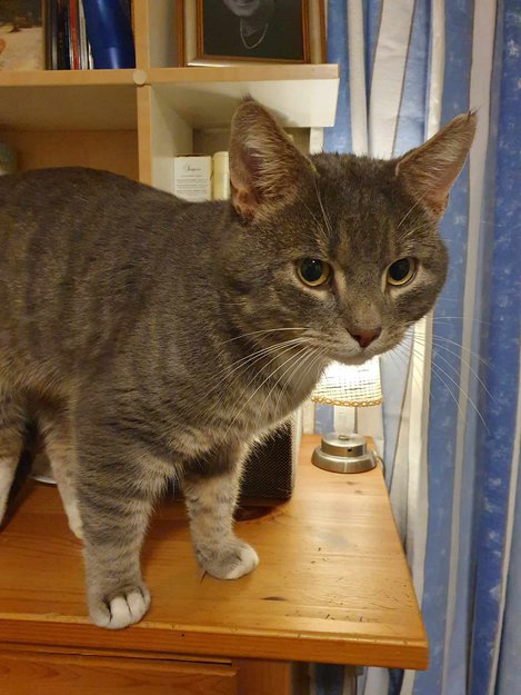 En ca. 6-8 mnd hankatt begynte å vanke hos meg i mars. Veldig sulten. Fulgte minne 2 hunkatter inn om natten. Var Ustelt i mai og fortsatte å komme. Finner han om morgenen liggende på kjøkkenborde eller ute i paviljongen i hele sommer når det er dårlig vær. Fortsetter å komme. Bilde tatt i mars, så større nå. Har etterlyst eier i Kalverudgrenda (FB) Skal ta han med å sjekke chip, men ser ikke ut som han er kastrert eller cipa. Markerer seg alle steder. Ingen melder seg, leverer jeg han inn til en organisasjon i august. Har 2 katter selv og kan ike ha han gående hos oss. Mine katter slapper ikke av.