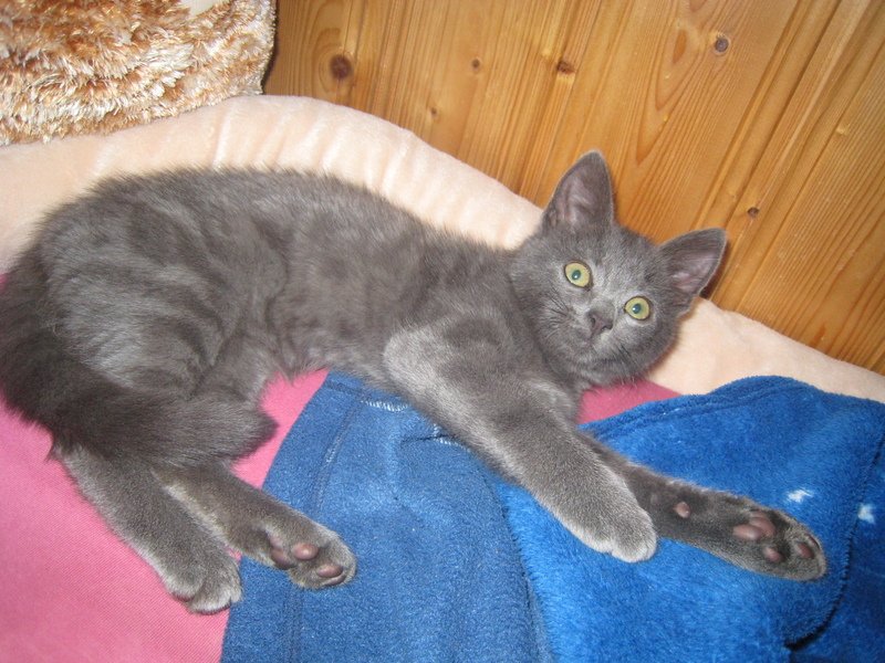Grå og mørkegrå i tabbymønster, spesielt sterkt mønstret på bakkroppen. Liten og slank katt, ser ut til å være huskatt.