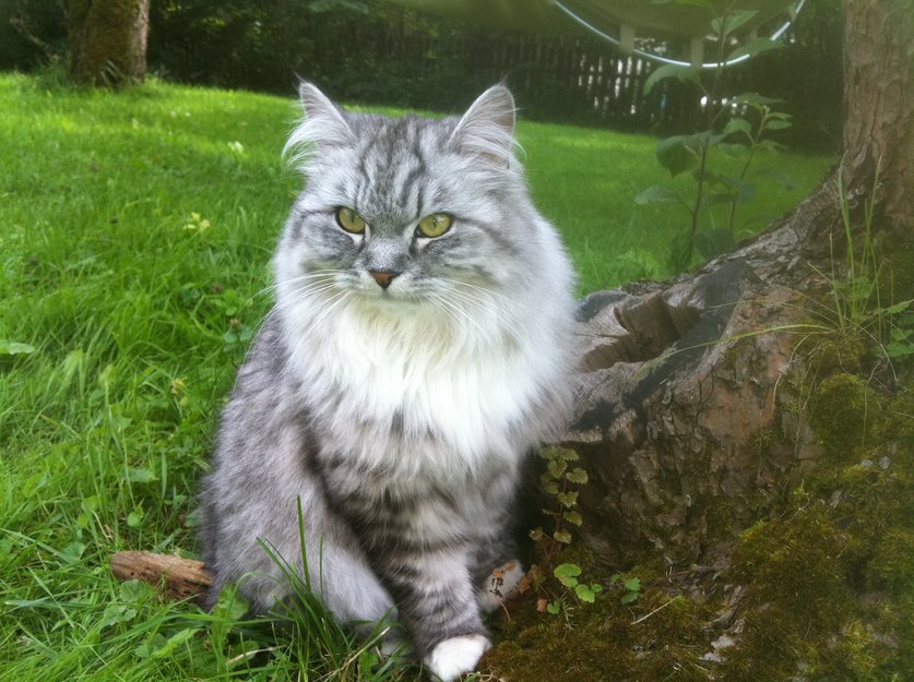 Vakker hunnkatt med lang grå og hvit pels med symmentriske tegninger. Hvit pels innerst. Lys brune øyne og nese. Store poter med ekstra pels. Kraftig bygget katt. Tillitsfull, leken og rask på foten. Snill og kjælen. Glad i mat. 1 1/2 år gammel.