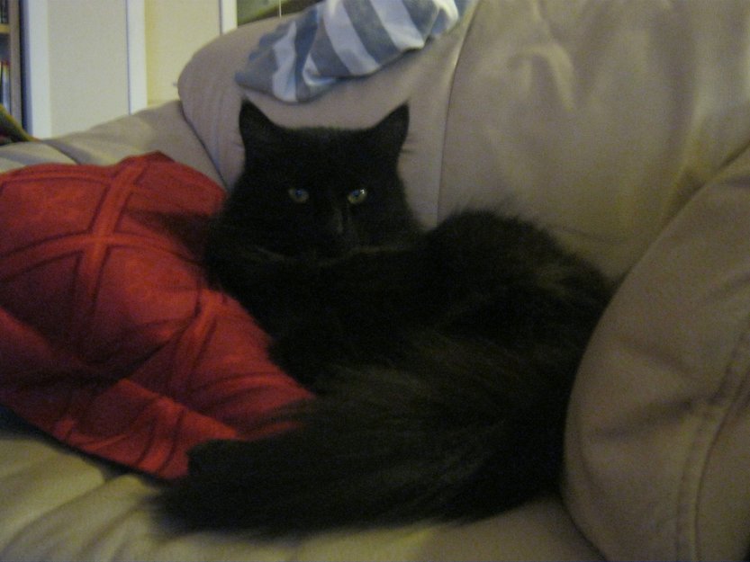 Han er en helsvart katt, med noen få grå/hvite hår her og der, gule øyne.