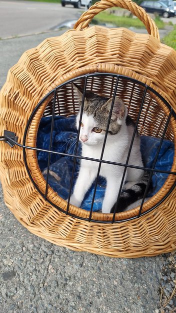 Hørte en katt hyle rundt 10 på formiddagen. Etter en stund gikk jeg og mannen min ut på verandaen for å se om den var i nød. Da så vi at den var svært ung. Vi holdt øye med den en liten stund i fall eier var på vei ut for å hente, men da det ikke så ut til å skje bestemte vi oss for å ta den inn. Den har fått mat og vann og vært sjekket for chip hos veterinær uten hell. Ser ut til å være en tre måneder gammel hunnkatt.