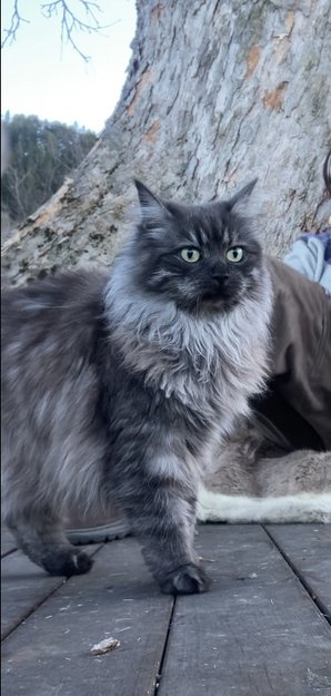 Hunnkatt, fjær-aktig hale som gjerne står rett opp i været. Hun mangler en tann, har gul-grønne øyne og et lite hakk i det ene øret. Hun har mye pels og er liten for rasen sin, som er en blanding av maine coon og norsk skogskatt.