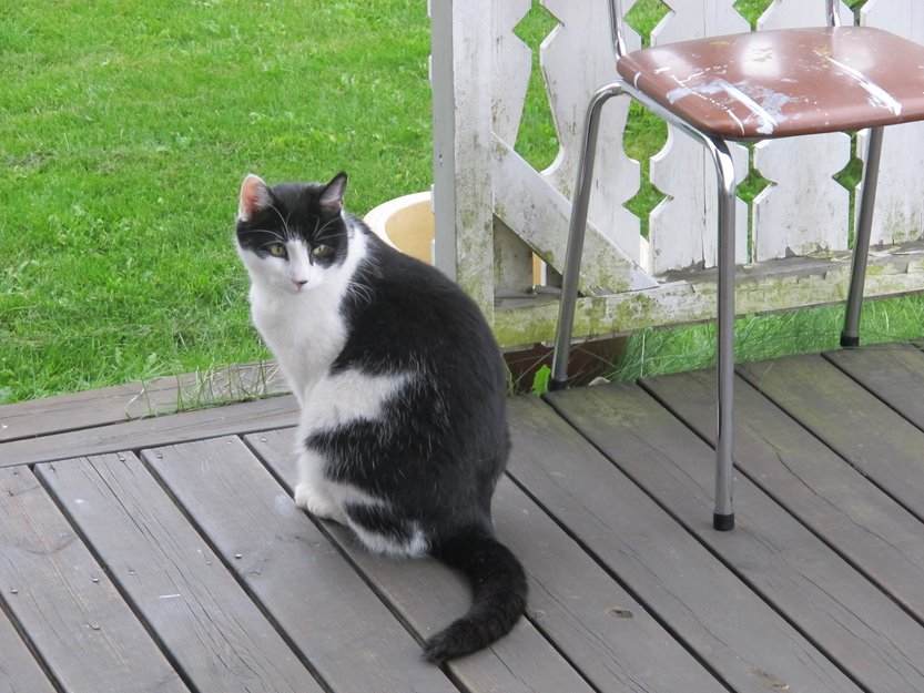 Har bare dukket opp her. Veldig vant med mennesker og tydelig vant med andre katter. Stor katt og veldig glad i mat.