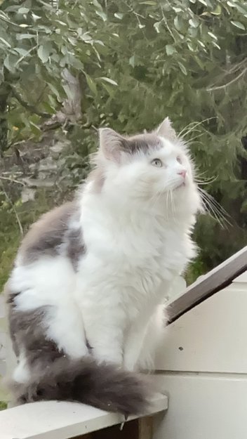Veldig skvetten og redd for folk. Sover utenfor hos oss nesten hver natt. Virker sulten og ustelt. Sniker seg inn for å spise mat om døren er åpen, løper fort ut om vi prøver å nærme oss den.