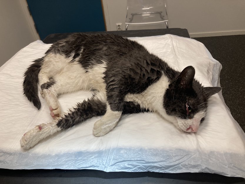 Påkjørt av bil. Hele høyre side skadet. Øye, snute, brukket skulder og hofte. Mulig indre blødninger. Dyrlegen måtte avlive den raskt. Stav vetrinær, Tretten.