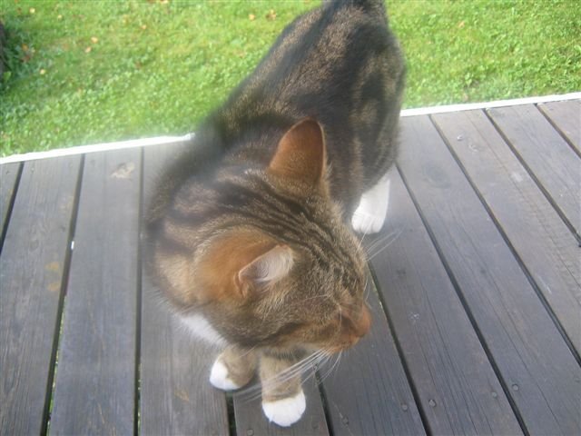 Korthåret hannkatt,grå og sort m litt brune striper,hvite labber og hvit under haka,kastrert,har et hakk i venstre øre,kjælen og veldig vant med barn.