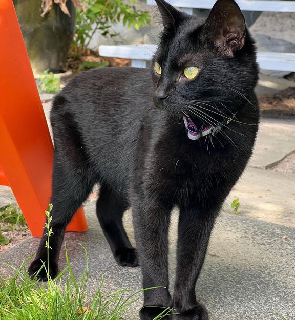 Hun er helt svart, med noen få hvite hårstrå bakerst på magen og litt rundt om på kroppen. Hun kan se ut som en kattunge/ungkatt da hun er så liten. Hun har ikke på seg noen halsbånd.