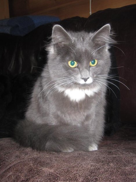 Grå med hvit "melkebart", hvit i brystet og hvit på potene.