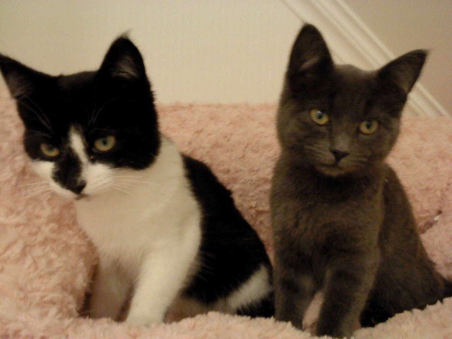 Dette er tydelig to søsken, den ene grå, den andre sort og hvit. Ca. 3 måneder gamle