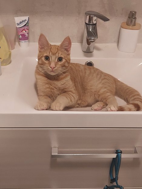 Han er helt oransj med mørke oransje striper enkelte steder. ( Blant annet på halen ) Han liker ikke å være på armen men elsker å kose føtter og få kos på hode og nakke. Han er veldig leken.