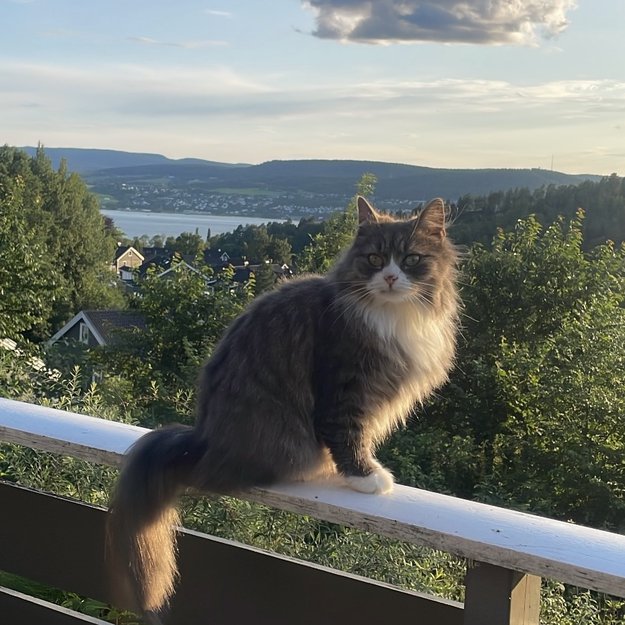 Liten katt med grå og hvit pels. Hunnkatt, sterilisert og chippet.