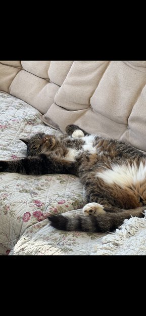 Både lyse og mørke trampdynor under potene. Høylytt når han vil ha mat eller vil ut. Veldig kosete, sikler når han får kos.