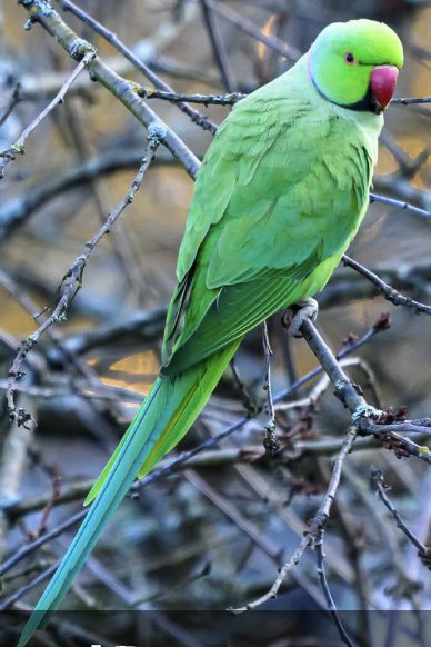 Smaragdgrønn, lang spiss stjert, rødt nebb og rød/rosa & svart krans rundt halsen.