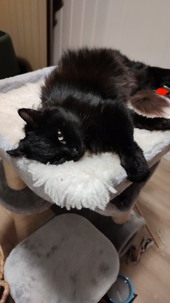Helsvart, langhåret hunnkatt, ca 2,5 år. Relativt liten og nett.
