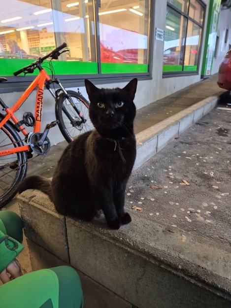 Katt vært utfor Kiwi Tasta i mer en 2 dager. Stramt halsbånd. Kosen maler høyt og raspete. Litt hvitt på halsen.