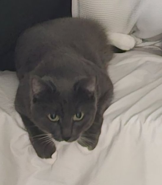 Den har ett läkt sår på ryggen då den blev attackerad av en annan katt. Så lite av pålsen är borta på ryggen då den var hos veterinären.
