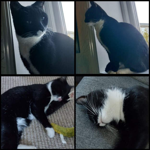 Svart og hvit hunnkatt. Hvitt bryst, litt hvit på snuten, hvit buk, hvite poter